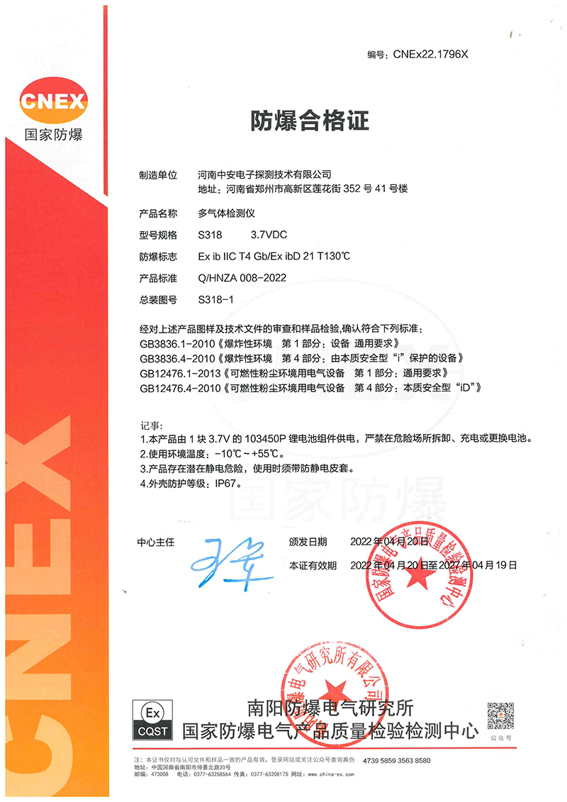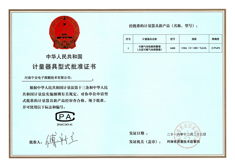 中安探測產(chǎn)品的立項(xiàng)、設(shè)計(jì)、研發(fā)符合市場需求、符合國家產(chǎn)品質(zhì)量技術(shù)要求,儀表設(shè)計(jì)精美,檢測數(shù)據(jù)準(zhǔn)確穩(wěn)定,氣體探測傳感器及便攜式檢測傳感儀表均為防爆型設(shè)計(jì),質(zhì)量穩(wěn)定的產(chǎn)品先后取得國家計(jì)量器具型式批準(zhǔn)證書、國家防爆電氣產(chǎn)品合格證、國家防爆電氣設(shè)備安裝修理資格證、CCCF消防產(chǎn)品認(rèn)證證書、國家礦用產(chǎn)品安全標(biāo)志證書、國家環(huán)保產(chǎn)品證書、計(jì)算機(jī)軟件著作版權(quán)及實(shí)用型專利證書、外觀專利證書、商標(biāo)等證書。