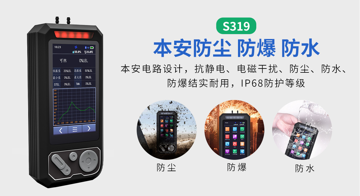 中安探測S319防爆型8合一氣體檢測報警器,可自由定制8種可燃氣體或有毒有害氣體傳感器進行檢測,防護等級IP68